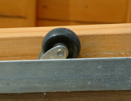 Castor wheels where fitted to the base of the roof, by drilling tight fitting holes and firmly gluing the castor 'pins' into position. It was original thought that 4 wheels on each side would be sufficient, but it was soon realised that more would be needed and in the end 8 wheels were fitted on each side. Wooden stops were fitted to the back of the roof so that it wouldn't easily roll all the way off and locking devices were fitted to the outside front face of the shed and the inside rear wall of the shed.