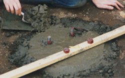 The hole was then filled with concrete ballast (a total of around 375 kg), which was mixed directly adjacent to the site. Checks were made on the position and orientation of the bolt-cage through the operation. After letting it stand for a while the Cradle support was temporarily removed and a circular dam placed around the top of the bolt-cage,which was then filled with more concrete and smoothed off as best as possible. The cradle battens were then replaced and the concrete left to set overnight.