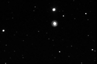 CCD Image of WDS 4498 Streamers of light, first though to nebulosity, are probably a form of glare from Betelgeuse which lies around 24 arc min north of this image.. |