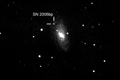 | CGCG 108-13 with SN 2006bt (Serpens Caput) 2006bt was discovered 2006-04-26.48 by Lick Observatory Supernova Search (Rochester Supernova site | Discovery Image | Reference Image) Image below (2006-05-09.015) was taken 12.5 days after discovery. Estimated magnitude of 2006bt is +17.1 (C filter). |
