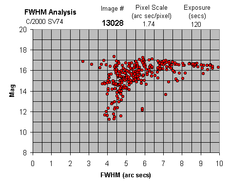 2 min exposure (#13028) and 5 min exposure (#13030) of C/2000 SV74 show FWHM values of around 4.0 arc secs. 13030