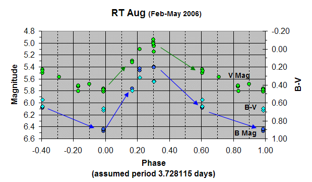 B-V trends through the magnitude minima. Nevertheless the light curve for RT